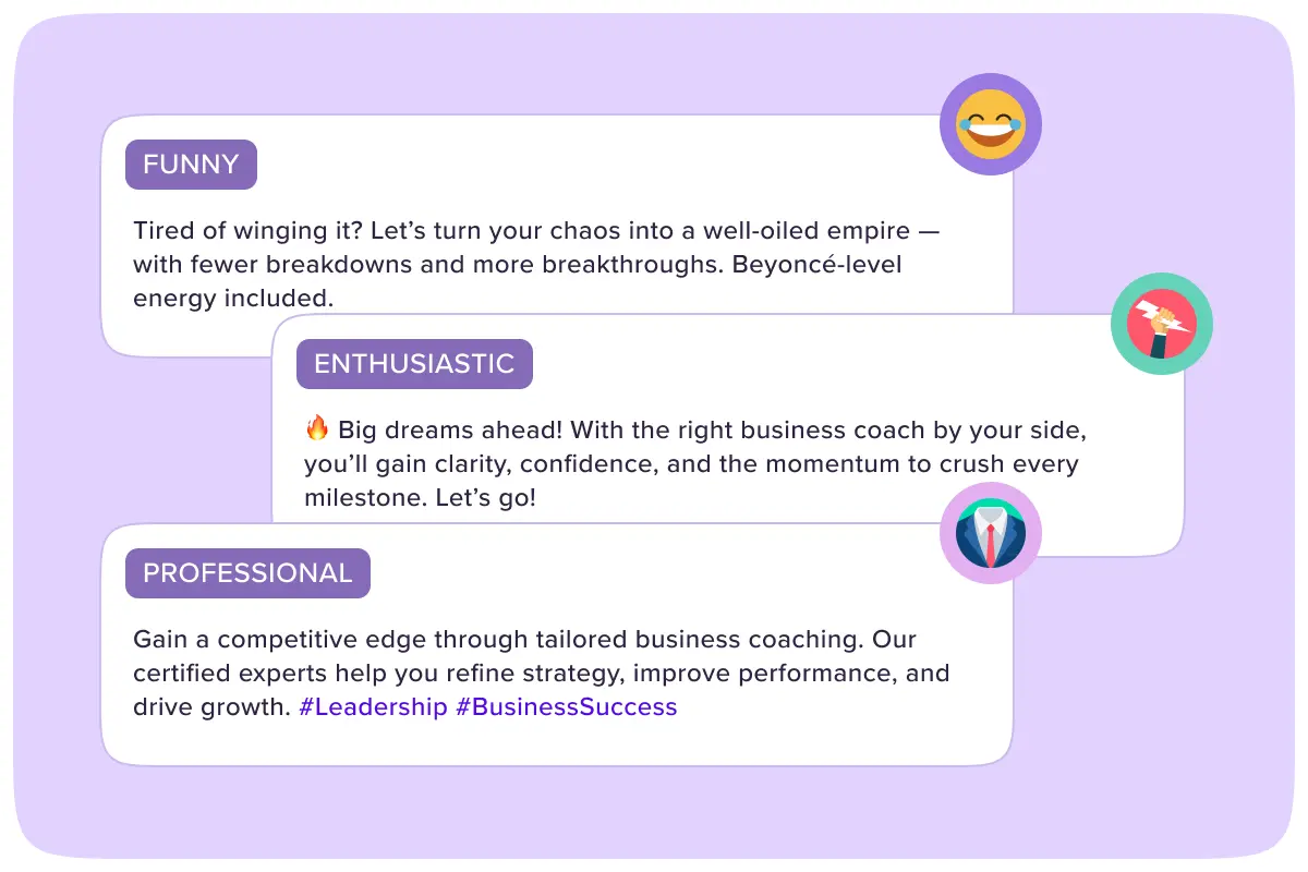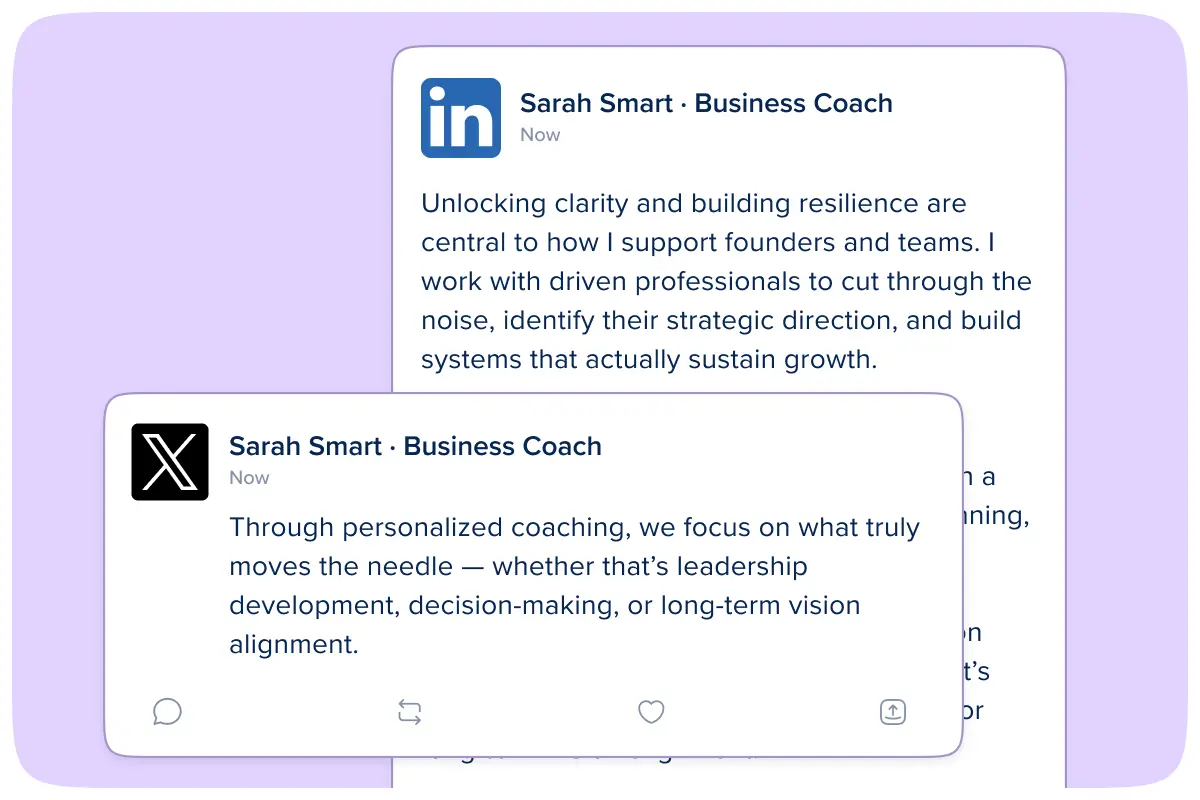 Transform your content creation workflow using AI that writes like a pro. Fill your queue with a week's worth of posts in seconds. It's like having your own personal copywriter that never runs out of ideas and knows exactly how to engage your audience.
